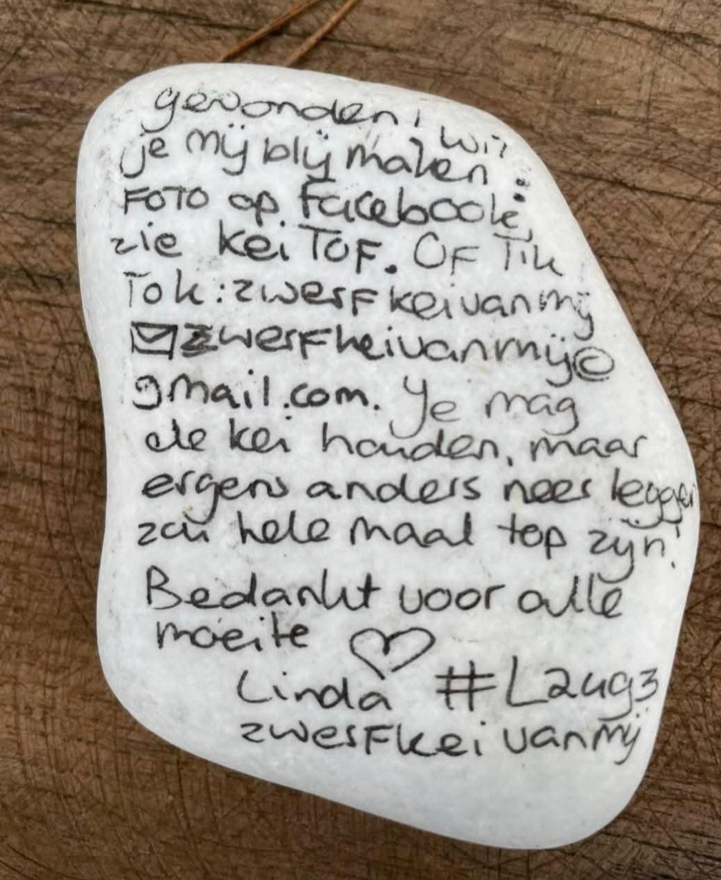 Omdat ik de cryptische beschrijving op de gevonden zwerfkei niet helemaal duidelijk vond, schrijf ik nu zelf een duidelijke uitleg achterop mijn Happy Stones. Op de meeste zwerfkeien staat KeiTof vermeld. Dat is een Facebookgroep waar je – met naam of anoniem – een melding kunt doen van een gevonden steen. Misschien denk je: waarom zou ik dat doen? Maar mij als maker maak je daar ontzettend blij mee. Zo weet ik of iemand de kei laat doorzwerven of besluit hem te houden. Op een gevonden steen staat ook vaak een hashtag. Bij mij is dat #L2493 (mijn postcode). Als je een kei meldt, is het fijn als je deze code in je bericht vermeldt. Ik check dagelijks mijn hashtag om te zien of er nieuwe vinders zijn geweest. Ideeën en voorbeelden opdoen Mijn Happy Stones-ideeën haal ik vooral van Pinterest. Vaak weet ik aan het begin van de dag nog niet wat ik ga tekenen of beschilderen. Ik open Pinterest, zoek een leuk plaatje en ga aan de slag. Daarnaast volg ik veel Facebookaccounts waar ook volop inspiratie te vinden is. Om makkelijker gevonden te worden, heb ik ook een account aangemaakt op Facebook en TikTok onder de naam Zwerfkei van mij. Daar deel ik foto’s van mijn beschilderde stenen en filmpjes waarin je kunt zien waar ik de Happy Stones heb neergelegd. Om het voor de mensen, die niet op social media zitten makkelijk te maken, heb ik ook mijn emailadres toegevoegd: zwerfkeivanmij@gmail.com, En zo krijg ik dagelijks hele leuke reacties