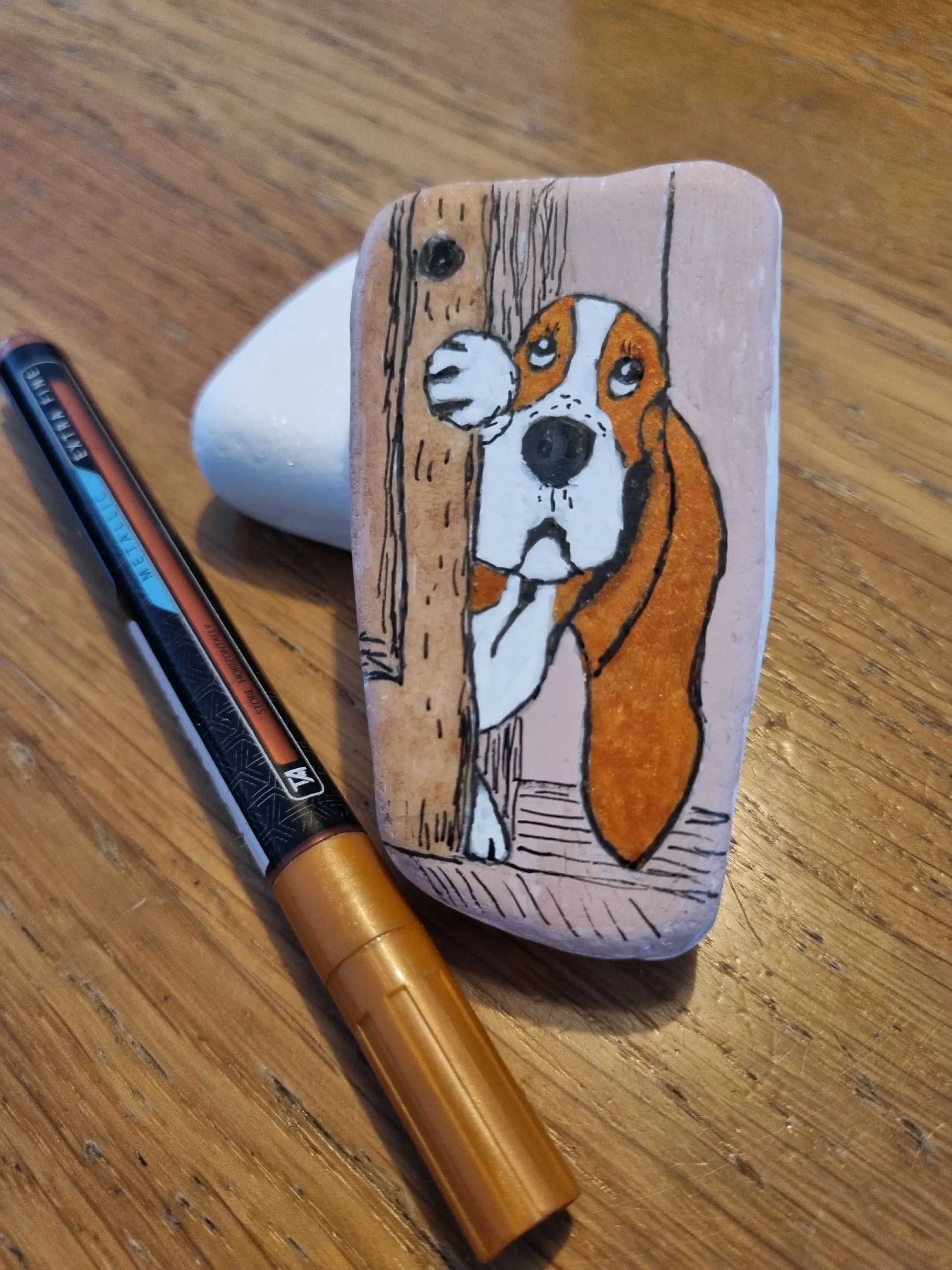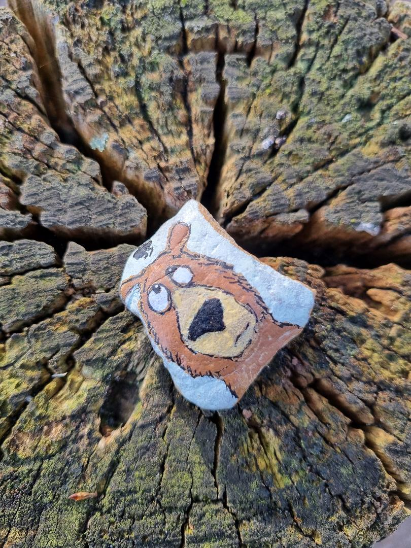 Al snel bleek dat de spullen van de Action niet zo goed werkten. De kleuren bleven niet lang mooi zitten en de gevonden stenen waren vaak erg ruw, waardoor tekenen niet zo makkelijk was. Hoewel ik als kind graag tekende, vond ik schetsen maken op oneffen stenen best lastig. Daarom kocht ik carbonpapier. Ik zocht leuke plaatjes op internet, printte deze uit en trok ze over op de kei. Dat werkte goed bij platte stenen, maar bij natuurlijke zwerfkeien was dit geen optie. Het carbonpapier ging dus weer weg en ik probeerde de afbeeldingen zelf na te tekenen. Dat ging de eerste keer zeker niet makkelijk, maar oefening baart kunst. Zelf ben ik erg trots op mijn hondensteen.